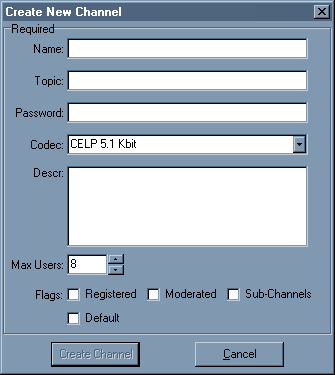 If you check Sub-Channels box, sub-channels are allowed to be created under your channel. This comes in handy when you have big teams in games which would communicate more efficient if broken up in groups. If you check the Default box your channel becomes the default channel which means that it is the first channel people come into when logging into your server (of course if they haven’t specified a channel while connecting). When you’re done with all the options you can press the Create Channel button to make the channel or Cancel to cancel the channel.