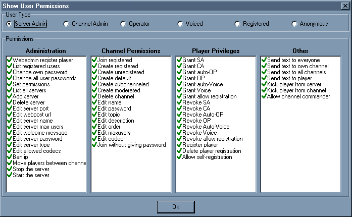 TeamSpeak 2 RC2 comes with a totally new permission system that allows flexible settings for all statusses on the server. Although the settings are done serverside, a client is greatly influenced by this system. Basically it sets what a client can and cannot do. It mostly affects the menu Channels, menu Players and menu Self. The permissions are shown in menu Info, Show Permissions.