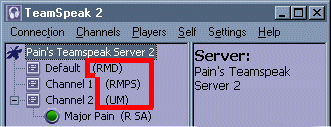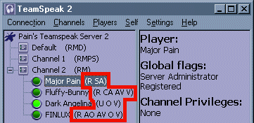 If you have started the TeamSpeak client you should now have a nice purple window in front of you divided in three separate sections. The left section, the Status Window, gives information about connections, like what server you are connected to, in what channel you are and who are present (how to connect to a server will be explained in Menu Connections). Behind channels there are letters between brackets which are called Flags. A brief overview: