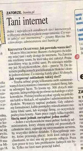 Strona ta to internetowa wizytówka sieci komputerowej, obejmującej swym zasięgiem kilkanaście bloków na olsztyńskim Zatorzu. Sieć powstała dwa lata temu z inicjatywy grupy młodych ludzi, którzy chcieli mieć dostęp do internetu, ale żadnego z nich nie było stać na kosztowną instalację sieci ani comiesięczne opłaty. Teraz za całodobowy dostęp do internetu i poczty elektronicznej jej użytkownicy płacą 50 zł, czyli trzykrotnie mniej niż za przyłączenie indywidualne.