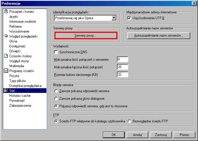 Serwer PROXYPrzeglądarka internetowa Opera jest bardzo ciekawym rozwiązaniem ze względu na swoją szybkość szczególnie na wolniejszych komputerach. Przeglądarka ta, dostarcza wraz z klientem poczty (niestety nie obsługuje on uwierzytelniania przy wysyłaniu), działa na systemach typu Windows, Linux, MacOS oraz wielu innych systemach "unixowych". Można ja pobrać ze strony producenta (język polski uzyskujemy pobierając dodatkowo spolszczenie):
