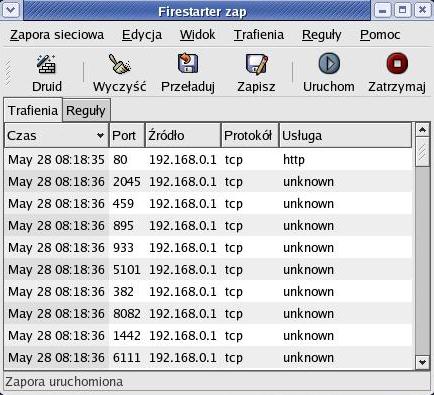 W systemie Linux istnieje szeroka gama programów do graficznej konfiguracji firewalla na iptables. Często wręcz co dystrybucja do jakieś nowe narzędzie, posiadające większe lub mniejsze możliwości ale z reguły pozwalające na bardzo podstawową konfiguracje. Dlatego też powstał program FireStarter do konfiguracji firewalla w prosty przystępny dla każdego sposób. W końcu nie każdy musi się znać na pisaniu reguł iptables, a chce ustawić owe reguły w trybie graficznym w prosty sposób nie mając zbyt o nich pojęcia. FireStarter jest pisany standardowo dla środowiska graficznego Gnome ale działa też w KDE i jest dostępny dla większości popularnych dystrybucji, do pobrania ze strony domowej programu www.fs-security.com. Poniższy opis powstał na bazie FireStarter w wersji 0.9x. Po zainstalowaniu osadza się ikonka koło zegarka, skąd możesz wywołać program, jak na obrazku poniżej, gdzie zobaczysz tzw. "Trafienia" czyli co FireStarter zablokował.