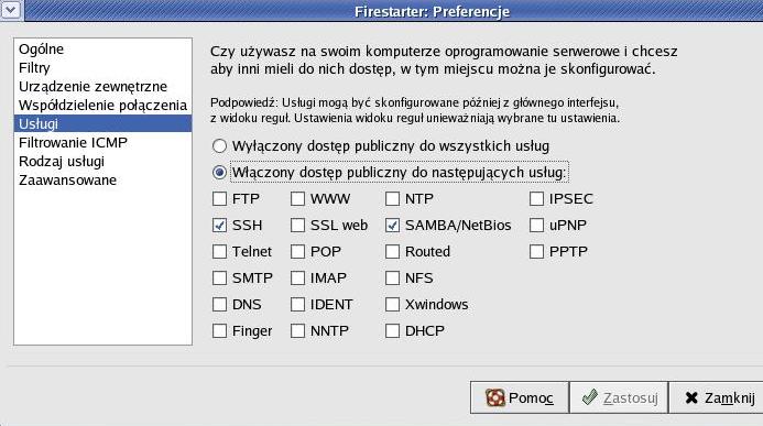 Następnie jest zakładka "Filtry" pozwalająca odfiltrować różne informacje z początkowego widoku trafień, takie jak zduplikowane trafienia oraz nie przeznaczone dla tego komputera. Dalsza zakładka to "Urządzenie zewnętrzne" gdzie wybierasz którym urządzeniem jesteś podłączony do sieci zewnętrznej czyli z reguły Internetu. Najczęściej będzie to urządzenie eth0. Dalej mamy "Współdzielenie połączenia" czyli możliwość skonfigurowania w prosty sposób tzw. NAT, przydatne jak masz jakoś siec za twoim komputerem. Zakładka "Usługi" pozwala nam włączyć wyjątki w naszym firewallu, żeby z zewnątrz był dostęp do określonych usług na naszej maszynie. Zaznaczamy opcje "Włączony dostęp publiczny do następujących usług" i wybieramy poniżej opcje "Samba/Netbios", ewentualnie jeszcze jakoś inną jeśli jest potrzebna jak na obrazku poniżej.