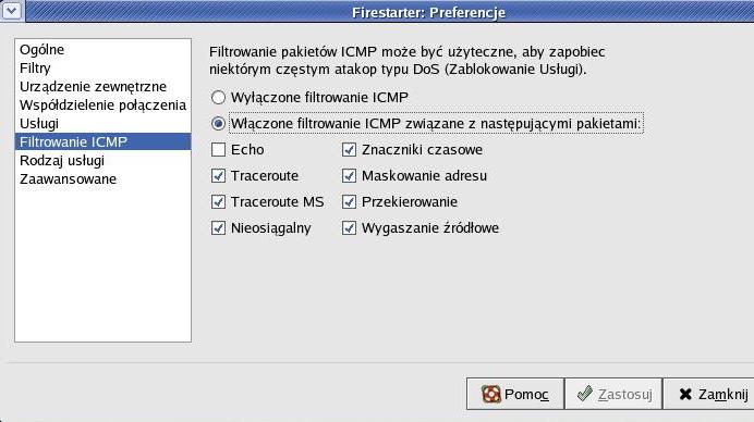 W zakładce "Filtrowanie ICMP" polecam zaznaczyć "Włączone filtrowanie ICMP związane z następującymi pakietami" i niżej zaznaczyć wszystko poza "Echo" co odrzuci wszystko poza zwykłym działaniem polecenia ping.