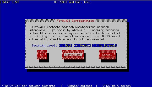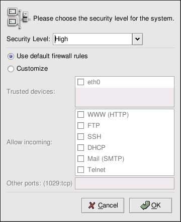 W Linux Redhat w wersji 8.0, 9 oraz Fedora Core 1 istnieje narzędzie do konfiguracji firewall w trybie graficznym o nazwie Security Level Configuration Tool. Narzędzie to jest dostępne poprzez wybranie w Główym Menu (Main Menu) => System Settings => Security Level lub po prostu wpisaniu komendy redhat-config-securitylevel w oknie terminala (wiersz poleceń).