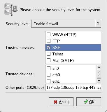 Powyższe okno Security Level Configuration Tool pochodzi z Linux Redhat 8.0 i jak widać możesz wybrać poziomy analogicznie do narzędzi z wiersza poleceń czyli High, Medium (zalecane) i No Firewall. Następnie zaznacz Customize i w Other ports wpisz 137:udp 138:udp 139:tcp i ewentualnie dla Samby 3.0 445:tcp. Niestety w Linux Redhat 9 oraz Fedora Core 1 zlikwidowano pole Other ports uniemożliwiając w prosty sposób własną konfiguracje firewalla opartego na iptables w trybie graficznym. Na szczęście opcja Other ports wróciła wraz z nowym wydaniem Fedora Core 2 i oby tak zostało jak widać na obrazku poniżej. W Fedora Core 1 zlikwidowano poziomy High i Medium zastępując je jedną opcją Enable Firewall.
