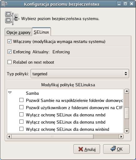 W tym wypadku interesuje nas działanie pakietu Samba i wchodzących w jego skład demonów nmbd, smbd oraz winbind w kontekście SELInux. Na obrazku powyżej pokazano ustawienia SELinux w narzędziu graficznym Security Level Configuration Tool, (system-config-securitylevel w Menu >> Administracja >> Poziom bezpieczeństwa) dotyczące właśnie Samby w Fedora Core 4. Jak widać do wybory mamy opcje: