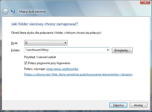 Następnie pojawi nam się okno w którym należy wpisać ścieżkę do udziału na zdalnym komputerze jaki ma być zmapowany. Ścieżka powinna mieć postać \\KOMPUTER\KATALOG czyli dla przykładu \\ARCHIWUM\FILMY. Możemy oczywiście tutaj zamiast wpisywać wybrać interesujący nas folder (nawet wewnątrz udostępnionego zasobu) poprzez opcje "Przeglądaj". W polu "Dysk" należy wybrać literę dysku pod jaka będzie widoczny na naszym komputerze zdalny katalog. Jeśli zaznaczymy opcje "Połącz ponownie po zalogowaniu" nasz zmapowany dysk będzie podłączany zawsze po restarcie komputera.