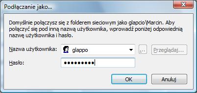 Jeśli chcemy łączyć się ze zdalnym katalogiem używając innego użytkownika niż domyślny (z reguły konto "Gość na zdalnej maszynie) wybierz opcje "Połącz używając innej nazwy użytkownika". UWAGA: Łącząc się jako inny użytkownik, po ponownym uruchomieniu systemu, Windows nie będzie pamiętał haseł do zmapowanych dysków. Jeśli chcemy żeby pamiętał te hasło, najlepiej użyć do mapowania dysków komendy net use, lub skryptów logowania (opis na końcu strony). Innym rozwiązaniem jest logowanie się do systemu na użytkownika/hasło takie samo jak do zmapowanego zasobu.