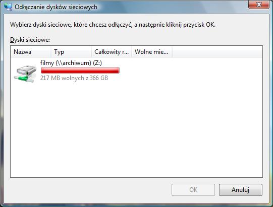 Odłączanie Dysków Sieciowych Procedura odłączania zmapownego dysku jest również prosta, trzeba na początku wybrać n menu kontekstowego "Odłącz dysk sieciowy". Pojawi nam się okno z wymieniona lista podłączonych dysków sieciowym, należy zaznaczyć ten który chcemy odłączyć i wybrać "OK".