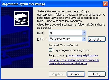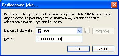 Jeśli chcemy łączyć się ze zdalnym katalogiem używając innego użytkownika niż domyślny (z reguły konto "Gość na zdalnej maszynie) wybierz opcje "Połącz używając innej nazwy użytkownika". UWAGA: Łącząc się jako inny użytkownik, po ponownym uruchomieniu systemu, Windows nie będzie pamiętał haseł do zmapowanych dysków. Jeśli chcemy żeby pamiętał te hasło, najlepiej użyć do mapowania dysków komendy net use, lub skryptów logowania (opis na końcu strony). Innym rozwiązaniem jest logowanie się do systemu na użytkownika/hasło takie samo jak do zmapowanego zasobu.