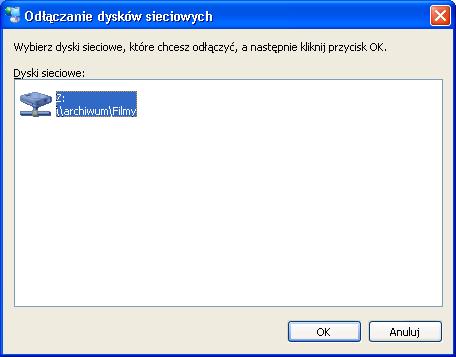 Odłączanie Dysków Sieciowych Procedura odłączania zmapownego dysku jest również prosta, trzeba na początku wybrać n menu kontekstowego "Odłącz dysk sieciowy". Pojawi nam się okno z wymieniona lista podłączonych dysków sieciowym, należy zaznaczyć ten który chcemy odłączyć i wybrać "OK".