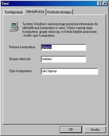 Dostęp do "Otoczenia sieciowego" w Windows 95/98 odbywa się poprzez np. ikonę na Pulpicie, w Windows Millenium ikona ta nazywa się "Moje miejsce sieciowe". Standardowo w otoczeniu ujrzysz komputery które maja zainstalowane "Udostępnianie plików i drukarek w sieciach Microsoft Networks" (systemy Windows) lub uruchomiony demon Samba (systemy Unix). Nazwa komputera, grupa robocza i komentarz Żeby twój komputer zaistniał w otoczeniu sieciowym musi m.in. posiadać swoją nazwę, przypisanie do grupy roboczej oraz ewentualny komentarz, który nie jest wymagany. Standardowo nazwa komputera jest generowana automatycznie i często jest to jakiś dziwoląg i choćby z tego powodu warto ja zmienić na taka która nam odpowiada. W tym celu przejdź do "Panel Sterowania" >> "Sieć" i wybierz zakładkę "Identyfikacja", w której możesz ustawić: