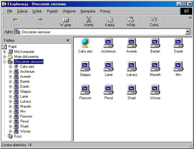 Utwórz tutaj wartość DWORD (REG_DWORD) o nazwie NoComputersNearMe i nadaj jej wartość 0 (zero), żeby wyłączyć restrykcje czyli aby była możliwość przeglądania listy komputerów lub 1 żeby ponownie włączyć blokadę przeglądania listy komputerów. Własne skróty w folderze "Otoczenia sieciowego"/"Moje miejsce sieciowe" Możesz też utworzyć własne skróty w folderze "Otoczenia sieciowego"/"Moje miejsce sieciowe" do różnych miejsc w sieci ale i też na własnym dysku. Do tego celu służy ukryty katalog "NetHood" - otoczenie sieciowe plików oraz "PrintHood" - otoczenie sieciowe drukarek. Teraz wystarczy że w katalogu "NetHood" utworzysz np. skrót do jakiegoś folderu i będzie on widoczny w "Moje miejsce sieciowe". Katalogi "NetHood" i "PrintHood" znajdują się w \%windir%\ czyli z reguły katalog "Windows". Serwer WINS Jeśli problemy z przeglądaniem otoczenia sieciowego (nie działa w ogóle lub działa za wolno) skonfiguruj sobie serwer WINS odpowiedzialny za z przeglądanie sieci SMB. Serwer WINS odpowiada za gromadzenie informacji o komputerach w sieci i usługach jakie one oferują. Owe informacje są gromadzone dzięki komputerom które korzystają z WINS, a następnie WINS udostępnia te informacje a w szczególności listę komputerów dostępnych w sieci. Taki zcentralizowany układ przyspiesza przeglądanie otoczenia sieciowego oraz redukuje ruch w sieci związany z przeglądaniem sieci. Z tych powodów zalecane jest ustawienie serwera WINS zawsze jak tylko jest to możliwe czyli jeśli taki serwer istnieje w sieci.