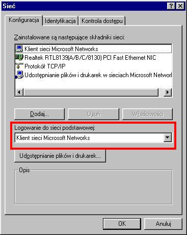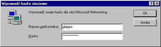Pierwsza linia znaczy że komputer ARCHIWUM posiada adres IP 192.168.1.1 i jest kontrolerem domeny NT WARIACI. W drogiej linii jest już tylko definicja "zwykłego" komputera i tak wpisy można mnożyć. Normalnie w Windows tego pliku nie ma - jest tylko przykład w pliku lmhosts.sam. Konto SMB Kolejny problem jaki możesz napotkać to dostęp do udostępnionych zasobów komputerów. Nie ma też problemu ze zwykłym dostępem na hasło o ile takowe znasz ;-). Natomiast gdy jakiś zasób jest udostępniony dla ciebie na użytkownika/hasło czyli na systemie używającym kontroli dostępu na poziomie użytkownika (m.in. Windows NT/2000/XP/2003, Samba/Unix) to mogą pojawić się problemy. Udostępnienie na użytkownika/hasło od zwykłego udostępnienia na hasło można odróżnić ze w w tym pierwszym przypadku jesteś proszony o hasło już przy dostępnie do komputera, a w drogim dopiero gdy próbujesz dostać się już do konkretnego zasobu. UWAGA: W Windows 95/98/Me potrafi w sieci SMB (czyli w dostępie do udostępnionych zasobów) używać tylko ciągle tej samej nazwy użytkownika i żeby zmienić użytkownika "sieciowego" musisz przelogować się w systemie, gdyż użytkownik sytemu jest równoznaczny tutaj z użytkownikiem "sieciowym". Poniżej jest zawarty opis jak logować się do sieci na danego użytkownika.