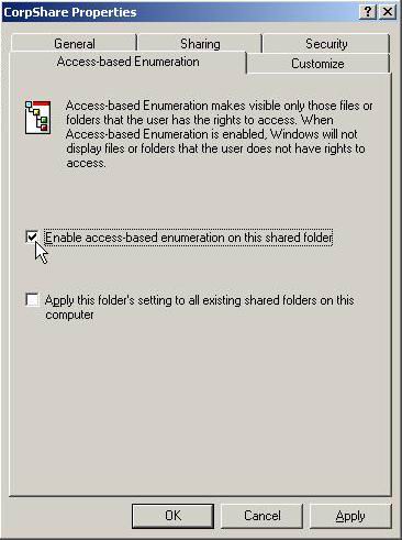 użytkownika oraz ustawione przez nas hasło. Udostępnianie katalogu UWAGA: Żeby jeszcze bardziej skomplikować życie użytkownikom możesz ustawić, że dany użytkownik może logować się tylko w określonych godzinach lub tylko z danego komputera. Dzięki tym ograniczeniom będziesz miał jeszcze wierszą kontrole kto, kiedy i skąd się podłączą do twoich udostępnianych zasobów. Jak tego dokonać przeczytaj w dziale Użytkownicy i uprawnienia - Windows 2000/XP/2003 w punktach "Określenie godzin logowania dla danego użytkownika" oraz " Określenie listy komputerów z jakich dany użytkownik może się logować ". Access-based Enumeration - Windows 2003 SP1 Access-based Enumeration pozwala ukryć foldery i pliki w udostępnieniach dla użytkowników którzy nie mają do nich uprawnień. Czyli pozwala to na "ukrycie" plików do których użytkownik nie ma dostępu. Wymagane w tym celu jest posiadanie Windows 2003 wraz z dodatkiem Service Pack 1. Dodatkowo należy mieć zainstalowane rozszerzenie Access-based Enumeration, które można pobrać za darmo z Microsoft Download Center - Windows Server 2003 Access-based Enumeration. Owe rozszerzenie (w skrócie ABE) składa się z programu wiersza poleceń oraz interfejsu graficznego, przedstawionego poniżej i dostępnego we właściwościach folderu.