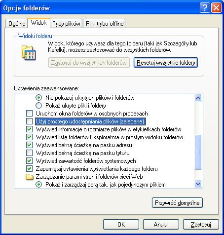 proste udostępnianie czyli przejdź do "Panel Sterowania" >> Opcje Folderów" i wybierz zakładkę "Widok"