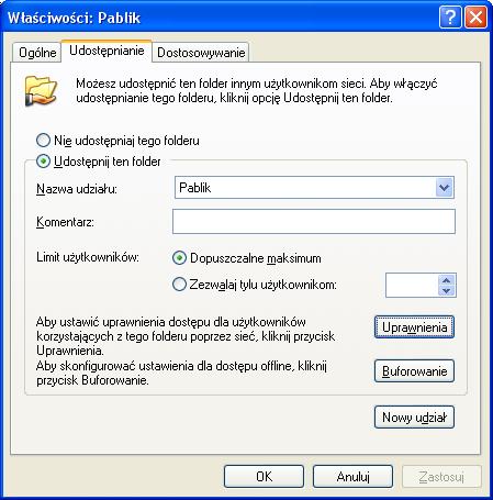 zaznaczamy "Udostępnij ten folder" i następnie wybieramy: Nazwa udziału - Czyli nazwa pod jaką